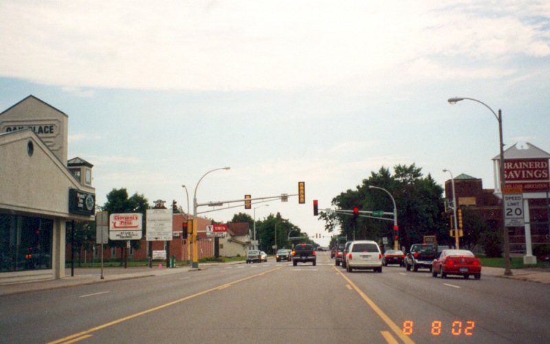 | Looking west at Oak St/8th St intersection. MN 18 formerly ran along Oak St from the east, then turned right here onto 8th St and up to MN 210. MN 322 continued along Oak St for 2 blocks to its intersection with then-MN 371 (seen in the background here and the above photo). Photo by Monte Castleman, taken in 2003. | |